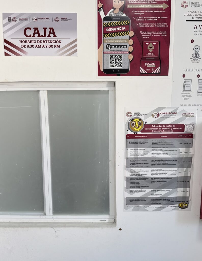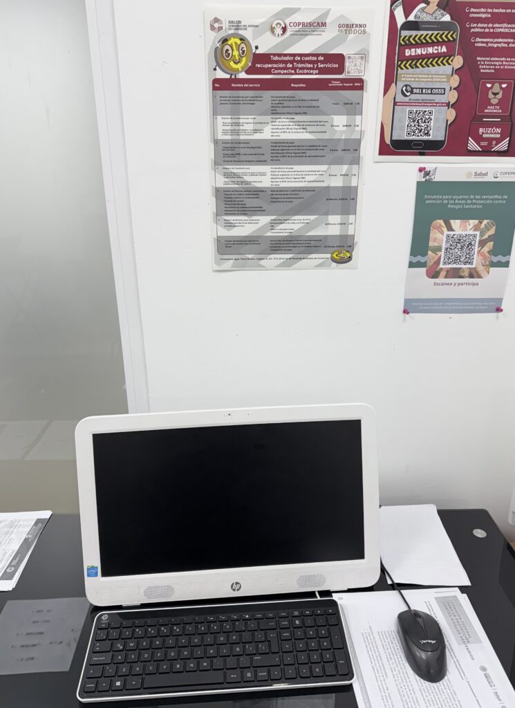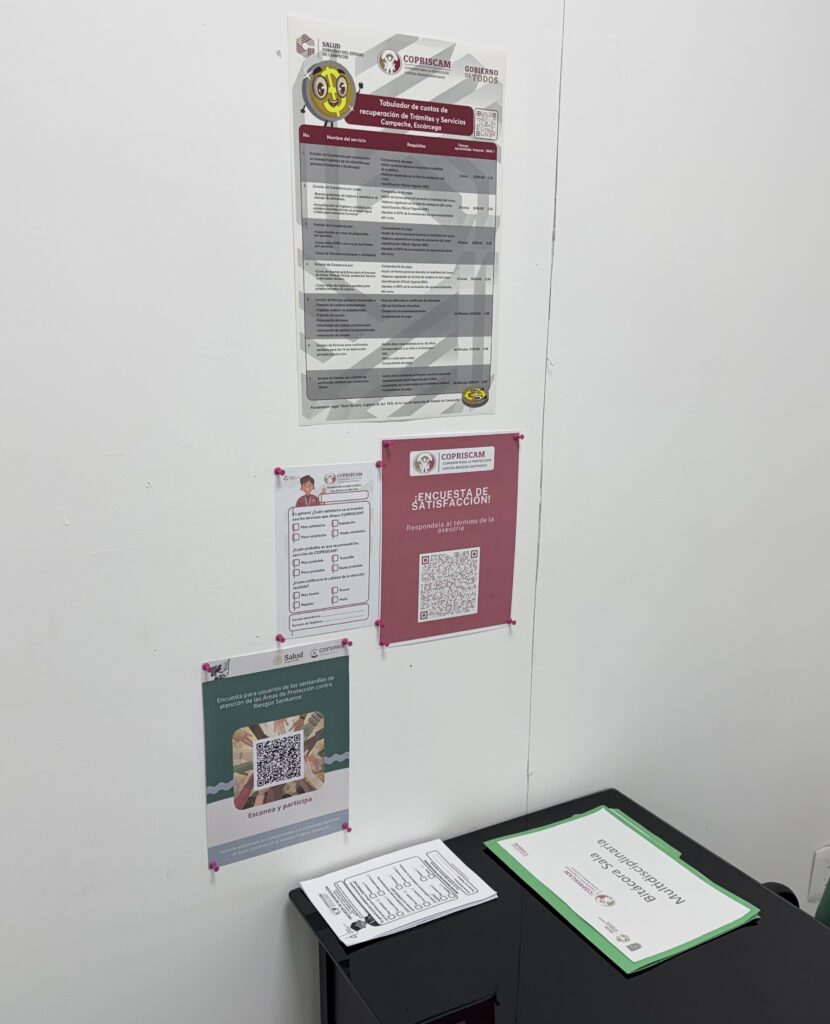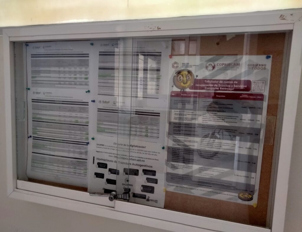 A113. Desde el inicio del presente año, se colocaron carteles informativos en lugares visibles de las Oficinas Centrales, de la Coordinación Regional de Escárcega y de la Coordinación Regional de Ciudad del Carmen; dichos carteles contienen el listado de los trámites y servicios ofertados por la COPRISCAM, incluyendo de manera clara y accesible los requisitos, tiempos de atención y costos vigentes correspondientes. Sin embargo, en dichas oficinas también se colocaron códigos QR con la información referida, para efecto de que las personas usuarias puedan descargar y acceder en cualquier momento al catálogo de los trámites y servicios ofrecidos por esta Comisión.