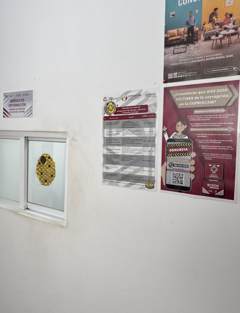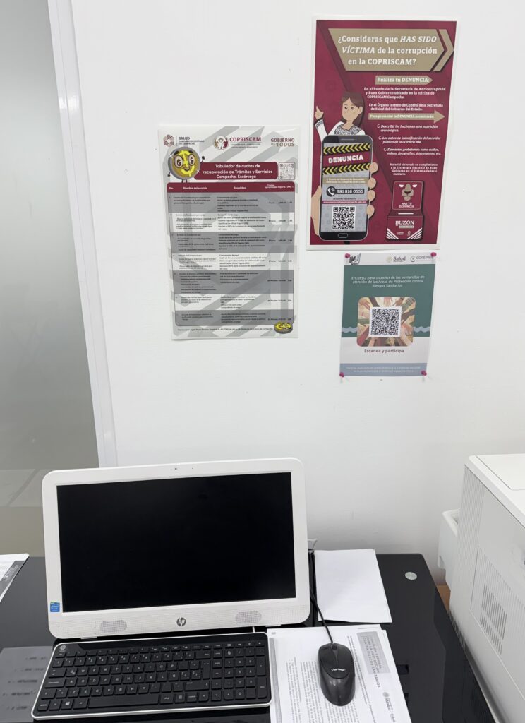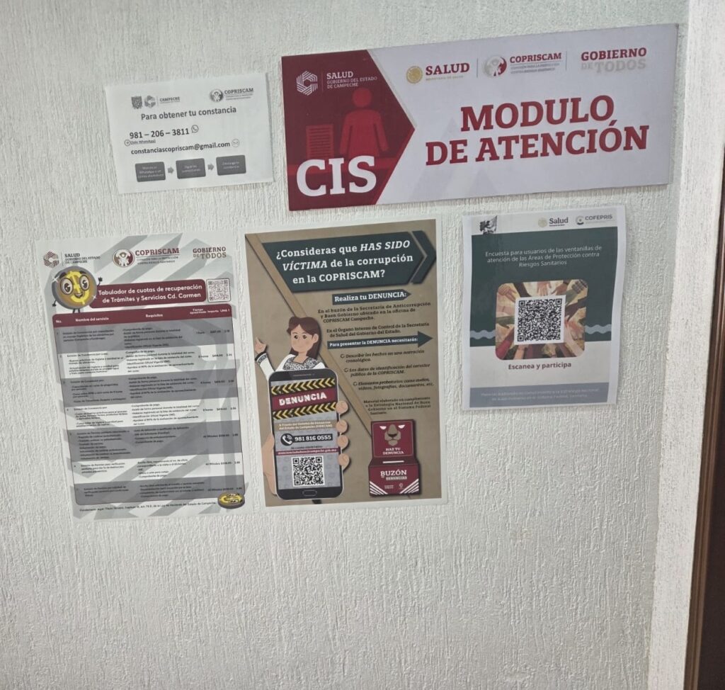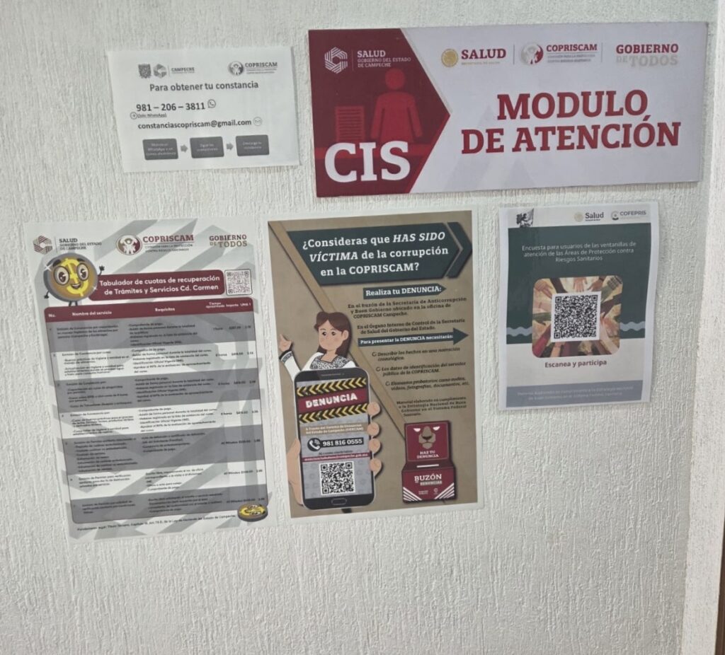 Fomento para la prevención A112. En el marco de las actividades de la ENBG, se prevé la difusión a través de medios físicos y electrónicos del procedimiento para la presentación de denuncias contra presuntos actos de corrupción por parte de las personas servidoras públicas de la COPRISCAM, por lo que, en cumplimiento de lo anterior, desde el primer día del ejercicio fiscal 2026 se colocaron Carteles informativos con el procedimiento de denuncia en lugares visibles para el usuario, específicamente en los Centros Integrales de Servicios de las Oficinas Centrales, de la Coordinación Regional de Escárcega y de la Coordinación Regional de Ciudad del Carmen. De forma complementaria, se implementó una encuesta de satisfacción para usuarios de las ventanillas de atención de la COPRISCAM en formato QR.