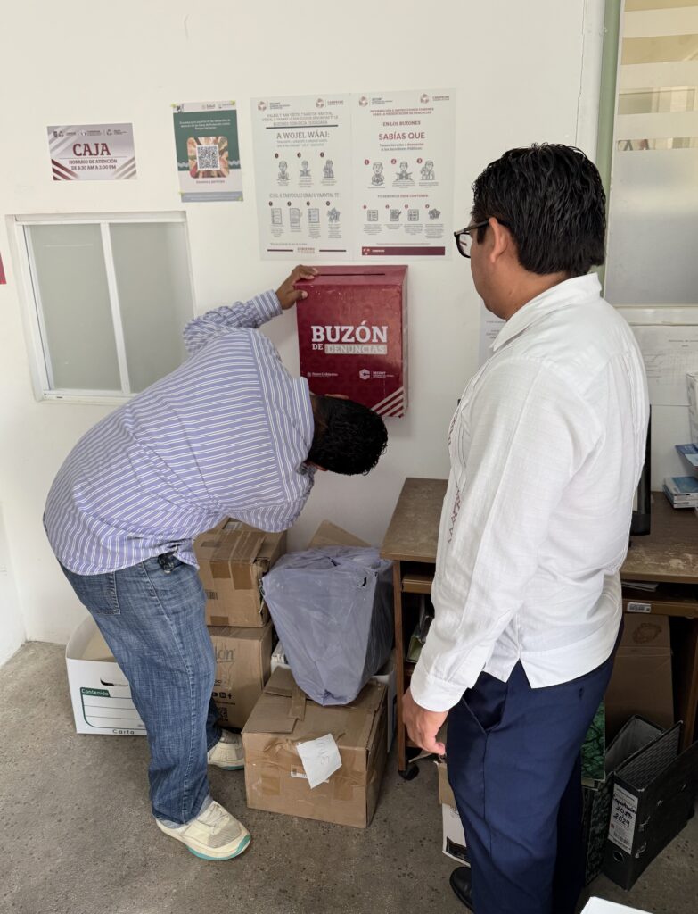 Adicionalmente, en el mes de febrero del presente año se llevó a cabo la revisión del Buzón del Jaguar de la Secretaría de Anticorrupción y Buen Gobierno del Poder Ejecutivo del Estado de Campeche, ubicado en las oficinas Centrales de la COPRISCAM, cuya sede se encuentra en la calle 16, número 17 A, entre 53 y 51, Col. Centro, San Francisco de Campeche, Campeche. Dicha revisión se llevó a cabo en presencia de personal de la Secretaría de Anticorrupción y Buen Gobierno, el Órgano Interno de Control de la Secretaría de Salud, la Líder de la Estrategia Nacional de Buen Gobierno y el Comisionado Estatal. Derivado de la revisión efectuada, no se encontró ninguna queja o denuncia.