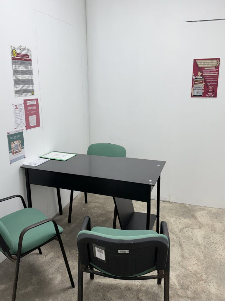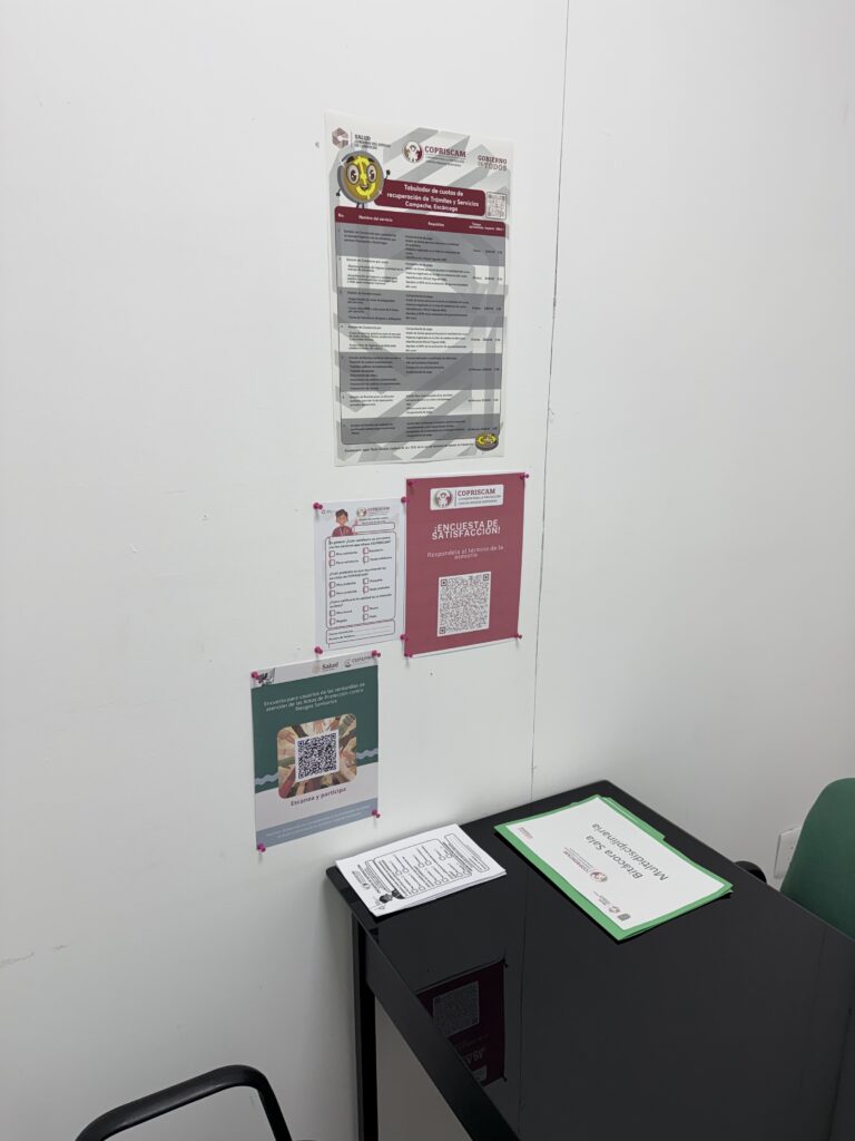 A120. La COPRISCAM cuenta con salas multidisciplinarias que están equipadas con cámaras de videograbación, en las cuales se les brinda atención a los usuarios del sector regulado y/o partes interesadas que así lo soliciten. Sin embargo, para tener un mejor control de las asesorías brindadas por el personal de esta Comisión, se debe llenar una bitácora que contiene la siguiente información: Fecha, nombre del servidor público, cargo, nombre del usuario, asunto, hora de inicio de la asesoría, hora de término de la asesoría y firma del servidor público. Además, se implementó una encuesta de satisfacción interna, para que al término de la asesoría brindada por el personal de esta Comisión, se realice el llenado de la encuesta, la cual podrá llenarse a través de un formulario electrónico, al que se puede acceder escaneando el código QR que se encuentra visible en la sala multidisciplinaria, o bien, si se tiene alguna dificultad para acceder al formulario electrónico, se proporcionará la encuesta de forma física. De igual forma, la COFEPRIS envió su propia encuesta de satisfacción a implementar, la cual, fue colocada en las ventanillas de atención y en la sala multidisciplinaria.