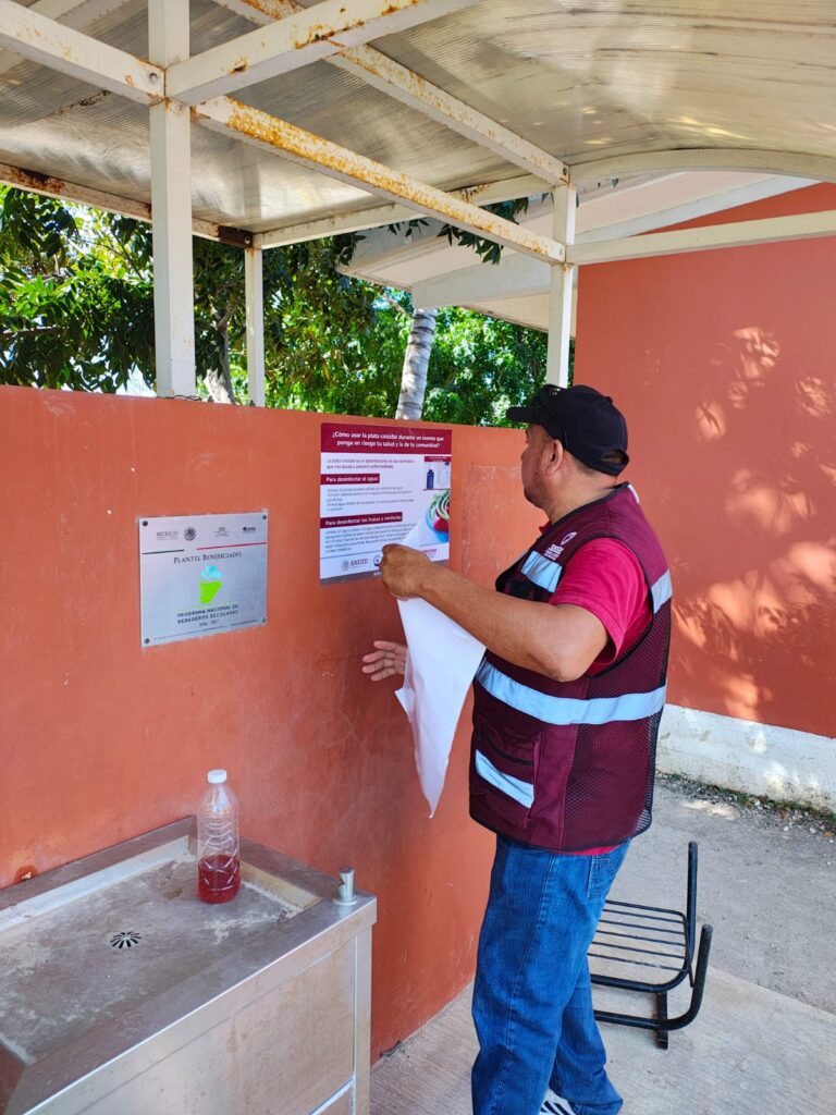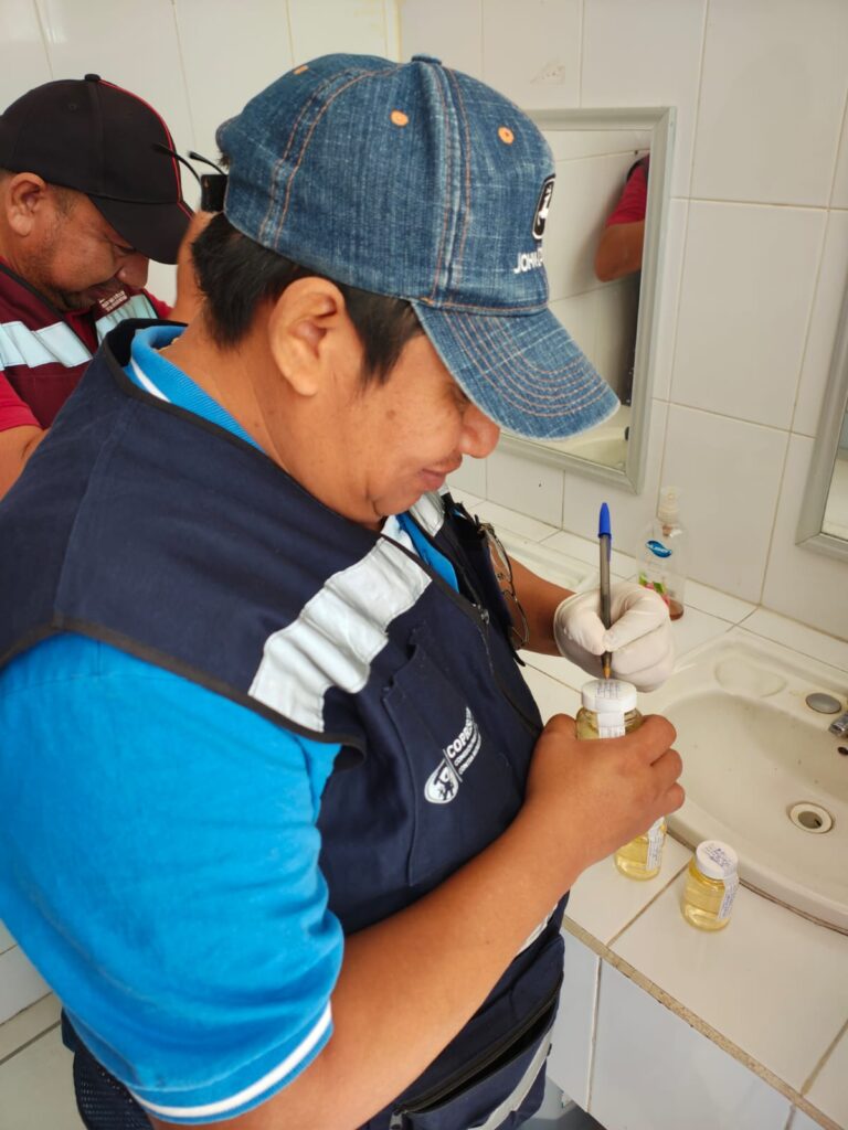 Se tomó la muestra para determinación de cloro residual, se realizaron pruebas rápidas Colilert, incluido en la capacitación todo el protocolo para la obtención del resultado. Posteriormente se cloró la cisterna, se revisó los depósitos de residuos sólidos, se caleó un área cercana a la cisterna, se colocaron carteles con información del uso de la plata coloidal y del lavado de garrafones.